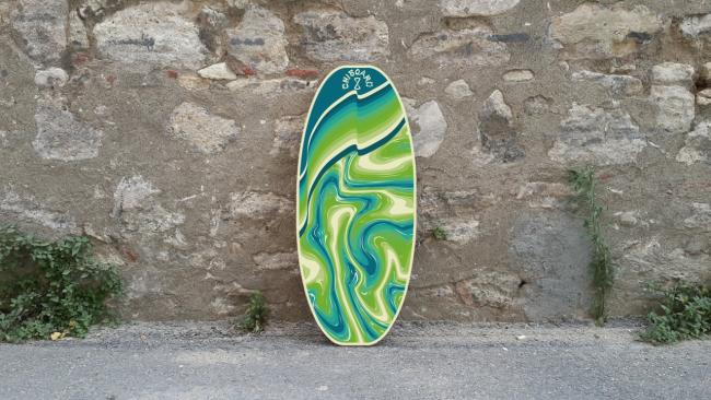 The Chiboard Classic Agua Deck is the Classic Deck with beautiful Agua graphics. It is still the conventional balance board deck that is being used since the first balance board. It is designed to respect the original form of first known balance boards. Its shape is elliptical and and symmetrical on its center. On its bottom surface there are 18 sockets for stoppers.
